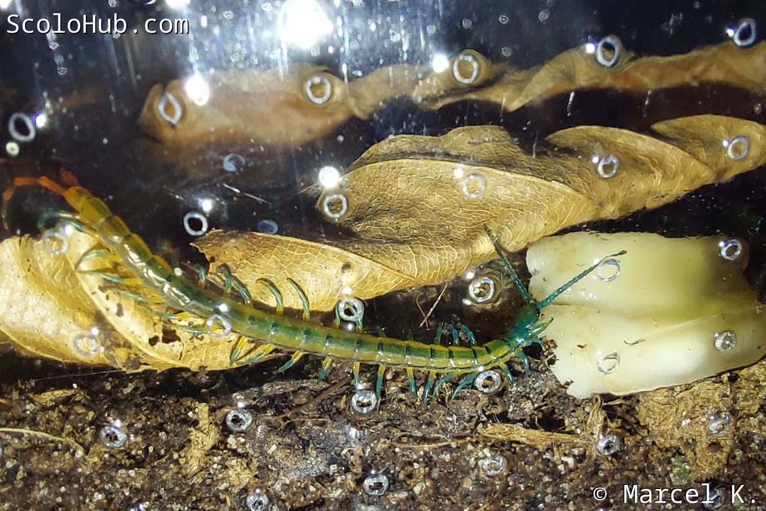 Gerade subtropische und tropische Arten scheinen also Obst zuweilen nicht abgeneigt. Darum kann man regelmäßig (einmal pro Monat o.ä.) tropisches Obst beifüttern. Bisher zeigte sich gerade Banane als äußerst beliebt bei Scolopendra gigantea, aber auch Scolopendra dehaani, Scolopendra subspinipes oder auch dem Mittelmeer-Hundertfüßer Scolopendra cingulata.