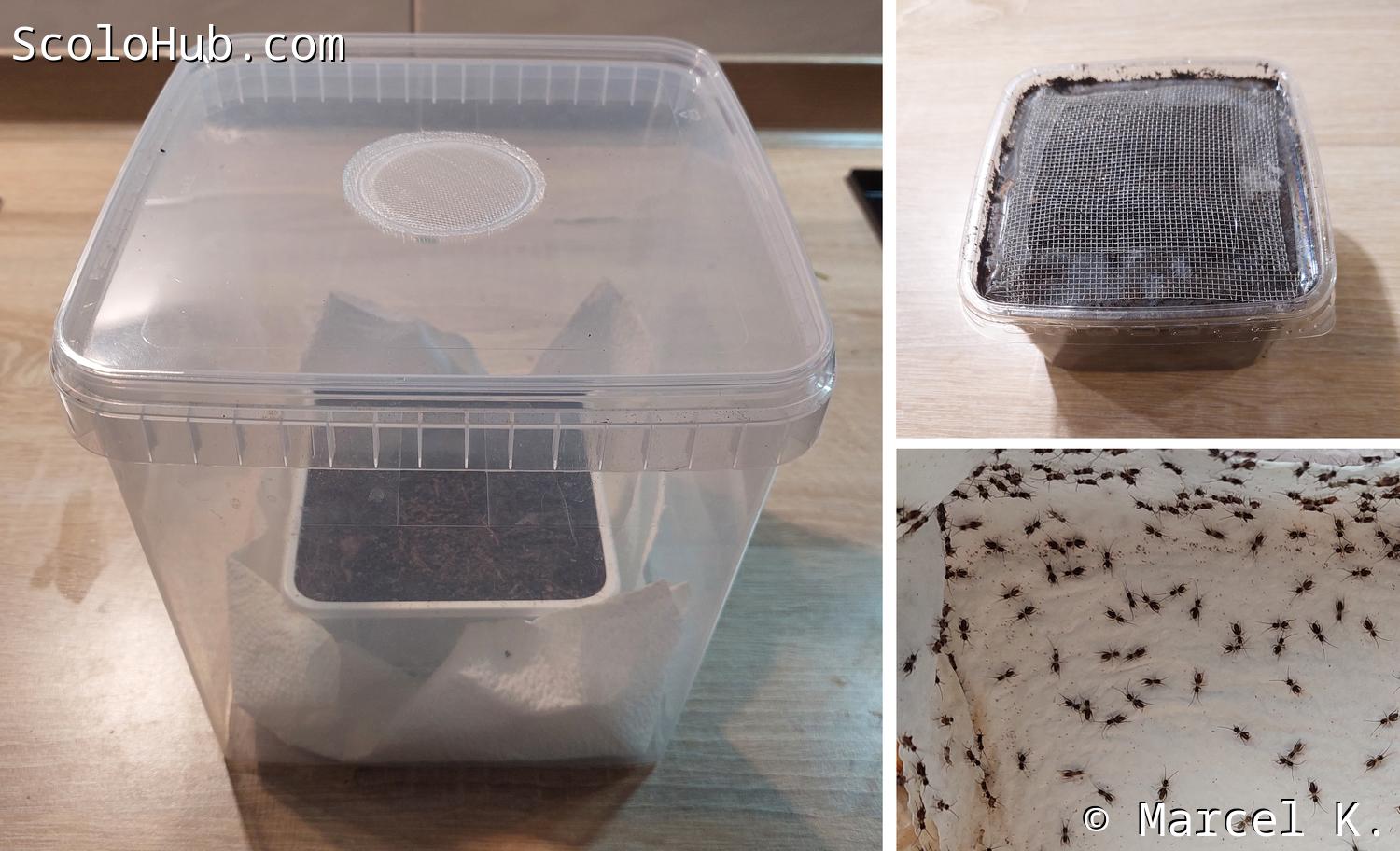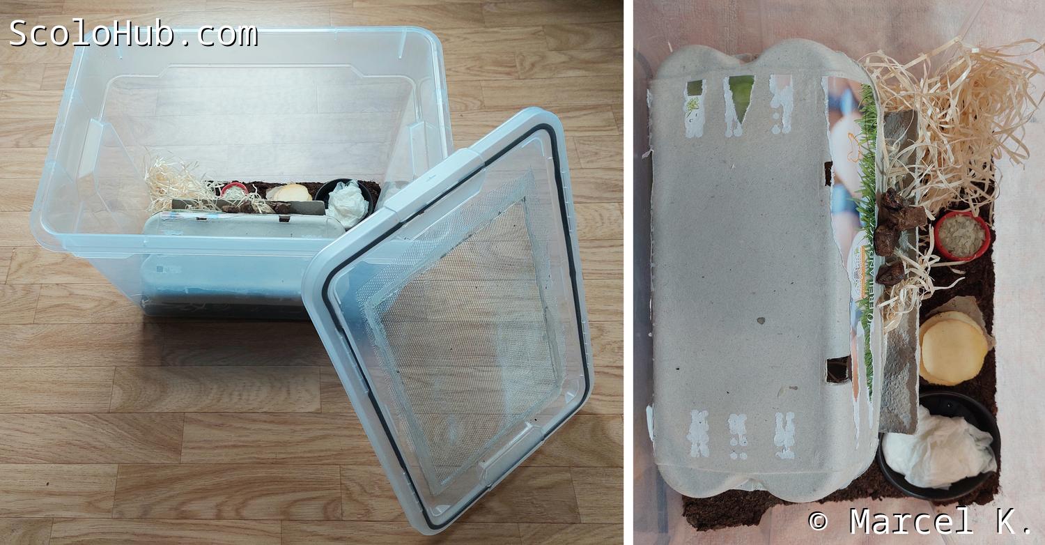 In die große Plastikbox wird eine dünne Schicht trockenes Substrat eingefüllt. Die Art des Substrats spielt eine untergeordnete Rolle und dient lediglich dazu, den Tieren einen Untergrund zum Laufen zu bieten. Im Anschluss werden Eierkarton und Holzwolle als Versteck- und Häutungsmöglichkeit in die Box gelegt. Ergänzt wird dies durch eine Futterschale. Da frischgeschlüpfte Larven etwas empfindlicher gegenüber Trockenheit reagieren, wird ein feuchtes Stück Zellstoff oder Zewa in der Futterschale platziert. Mittels Pipette kann diese dann je nach Bedarf nachbefeuchtet werden. Sind die Larven nach einigen Häutungen größer, wird der Zellstoff durch Nassfutter (Obst, Gemüse, Futtermischung) ersetzt.