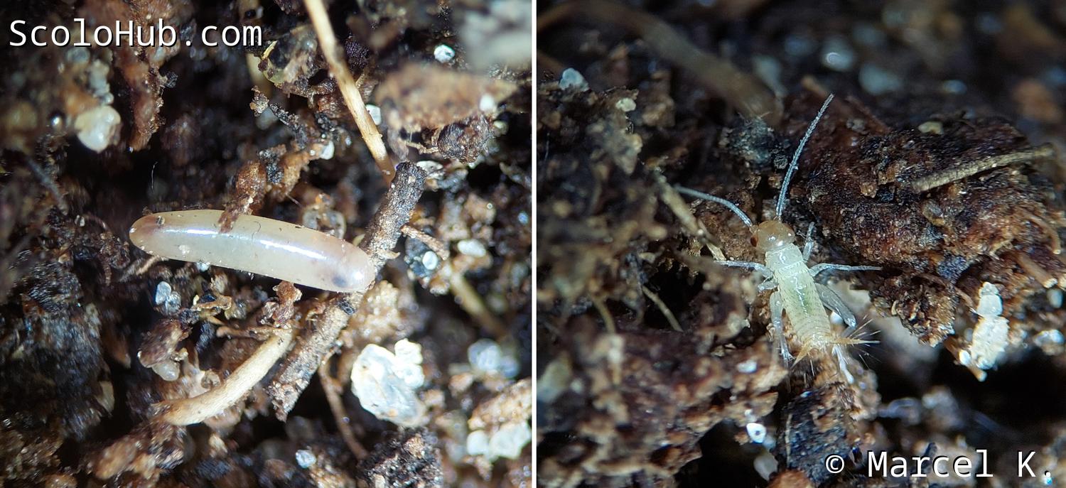 Im nächsten Schritt entfernt man den Deckel, die Gaze und den möglichen Kot der Elterntiere vom Eiablagebehälter und überführt diesen dann in eine Brablast-Box, die zuvor mit feuchtem Zewa ausgelegt wurde. Die Brutbox mit den Eiern sollte nun mindestens eine Woche warm stehen (tagsüber mindestens 25°C, nachts Zimmertemperatur). Dabei sollten Torf und Zewa konstant leicht feucht bleiben und gut belüftet werden. Es bietet sich an, die Brutbox nicht komplett mit dem Deckel zu verschließen, sondern diesen nur zur Hälfte abzudecken, um Kondenswasser und Schimmelbildung zu vermeiden. Nach ein bis zwei Wochen (abhängig von der Temperatur) schlüpfen die ersten Tiere. Kondenswasser im Behälter sollte nun auf jeden Fall vermieden werden, da die Larven daran haften bleiben und verenden. Zu Beginn kann man die Larven in der Brutbox für 3-4 Tage mit dünnen Apfelscheiben und Fischfutter anfüttern (in dieser Zeit schlüpfen in der Regel auch ein Großteil der Brut). Danach können die Tiere in eine vorbereitete Haltungsbox überführt werden, indem man den Eiablagebehälter aus der Brutbox nimmt und das gesamte Zewa mit den Larven in die Haltungsbox gibt. Später, wenn sich keine Larven mehr darin verstecken, kann das Zewa entfernt werden. Alternativ kann man noch den Eiablagebehälter mit dem Torf und den Eiern zusätzlich in die Haltungsbox geben, um mögliche Nachzügler zu erwischen.